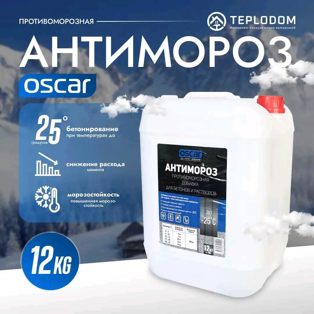 Антимороз Oscar для бетонов и растворов" — это добавка, предназначенная для защиты бетона и растворов от воздействия низких температур. Она помогает предотвратить замерзание воды в смеси, что может привести к повреждениям материала, улучшая его устойчивость в холодных условиях.