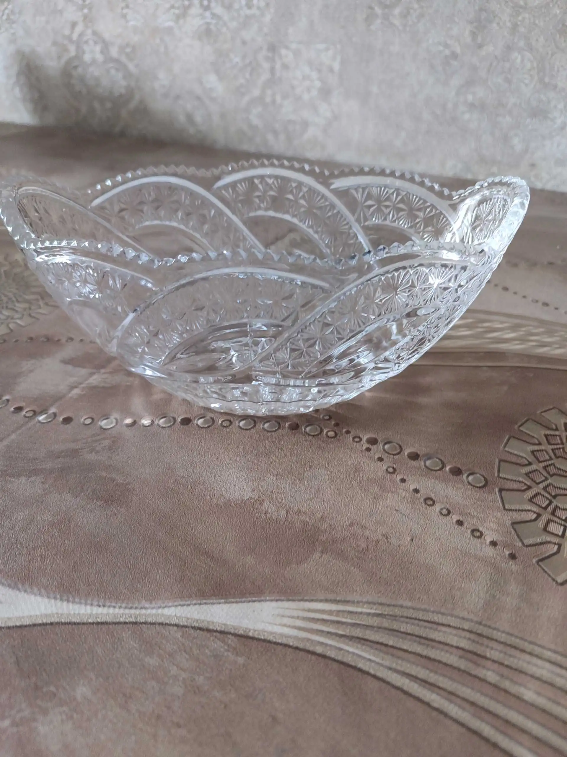 Элегантная прозрачная ваза из стекла с изысканным рельефным узором. Стенки украшены классическим геометрическим орнаментом с эффектом огранки, благодаря чему изделие красиво переливается на свету. Волнистый край придаёт вазе утончённость и лёгкую воздушность.