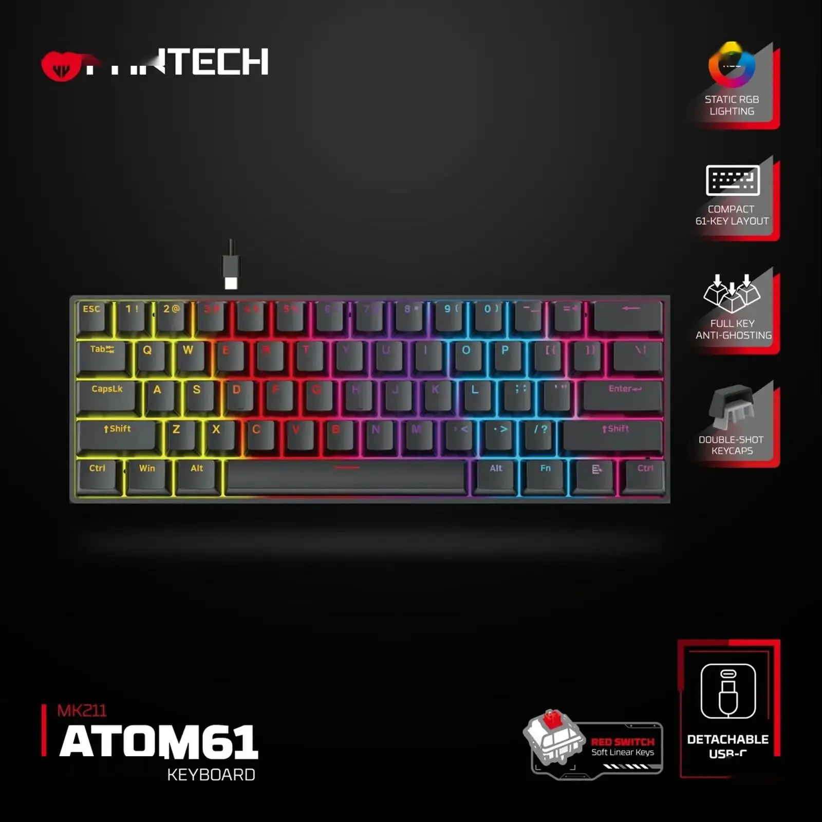 Ниже представлены основные технические характеристики клавиатуры Fantech MK211 ATOM61: