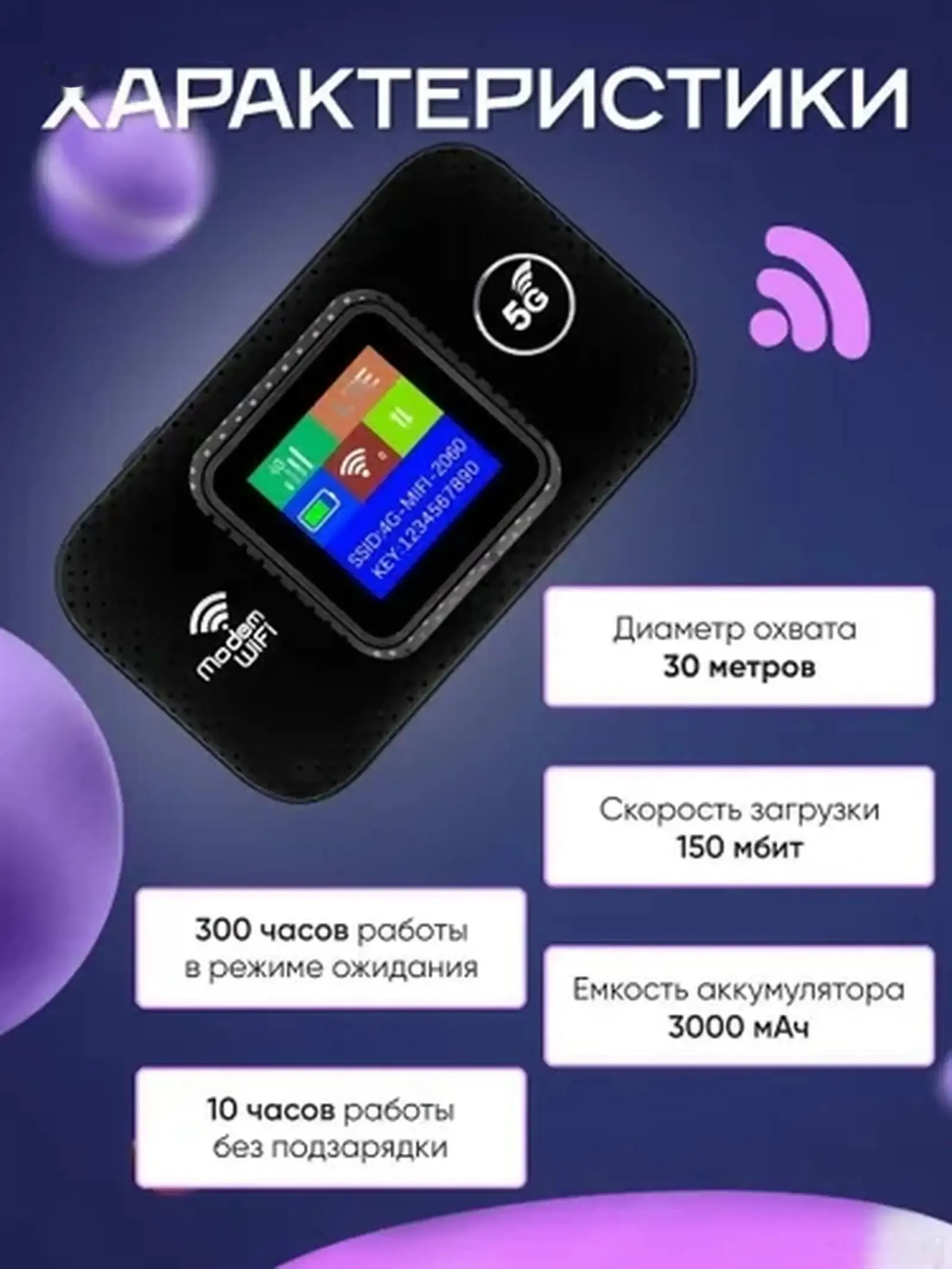 Wifi роутер модем, карманный 4G / 5G / LTE роутер, вай фай роутер с сим картой для дома и квартиры, максимальная скорость 300 мбит, ЖК экран, черный
