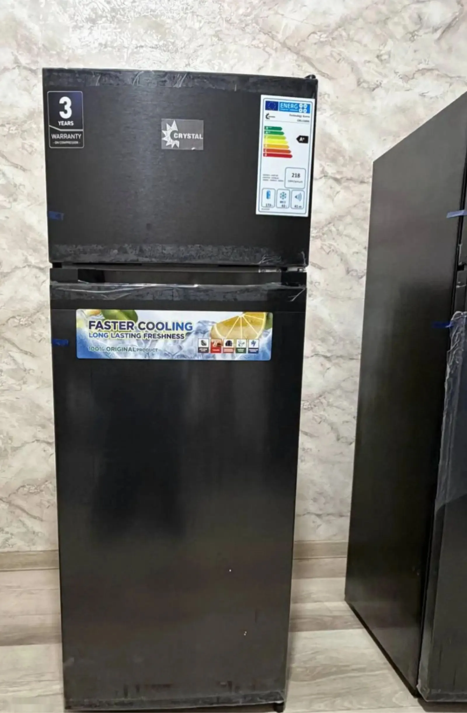 Современный двухкамерный холодильник CRYSTAL в элегантном чёрном цвете — практичное решение для...
